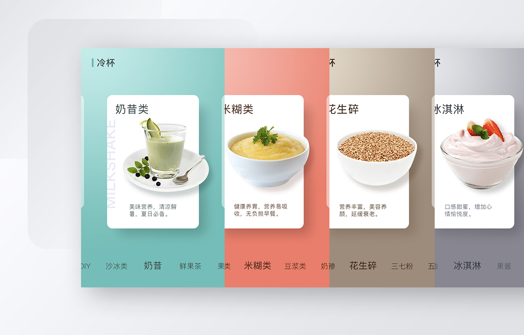首先,我们与苏泊尔一起洞察到料理机的多样化需求正在客户使用过程中形成,小家电不止于是一个厨房执行的工具,同时也是一个厨房巧手助理的角色,如何通过物理设计和数字化体验来满足客户需求,我们在此次设计中,保留了多样的菜谱设计,通过不同料理杯的切换,完成不同菜谱的切换。以不同色彩区分不同料理杯,每个系列料理杯延续首页色系,用户可以直观感受到各个系列杯体的不同,减少误操作。视觉上,内容清晰分层,我们采用菜谱大卡片切换的形式,主次分明,富有色泽的真实拟真质感。